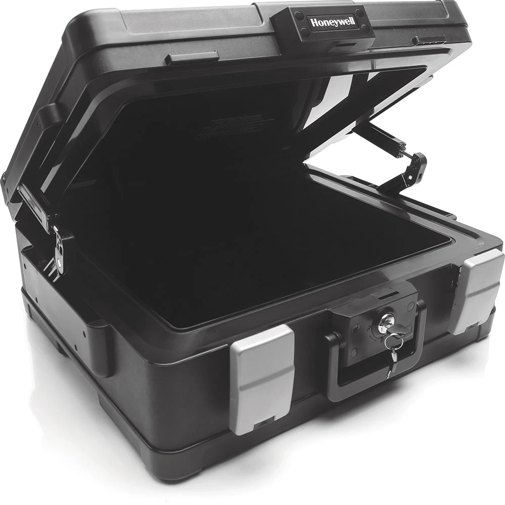 The Honeywell 1114 Lightweight Fire and Waterproof Chest is the lighter version of Honeywell’s 1104 Molded Fire/Water Chest. The Honeywell 1114 Lightweight Fire and Waterproof Chest features a storage capacity of .39 cubic feet. Secure unprecedented levels in peace of mind with this chest’s ability to withstand a fire of up to 1700° F for one hour! The addition of a waterproof seal and two side latches guards against emergency sprinklers, floods and various other forms of water damage. These features make it an ideal candidate for stashing all of your personal documents, digital media and various other valuables. The security box is also large enough to store your legal sized papers flat. For security measures, this waterproof chest utilizes a key lock system. A carry handle is also included and adds even more versatility to an already flexible product.