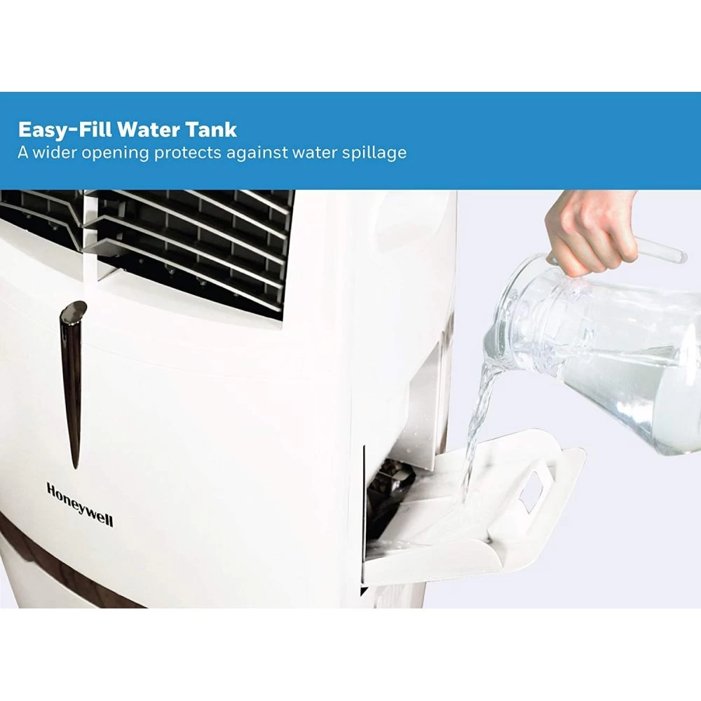 Honeywell Evaporative Air Coolers are an environmentally-friendly and cost-friendly cooling option for your home. Much like a breeze flowing across a lake or the refreshing cool air you feel near a waterfall, air coolers produce a comfortable, cool breeze with the natural process of water evaporation. When warm air is drawn into the Honeywell Evaporative Cooler, it is filtered through a wet honeycomb cooling medium, which absorbs heat and naturally cools and humidifies the air. A powerful fan pushes the cool air out of the front of the unit into the surrounding area. This no-compressor system cools naturally, efficiently and inexpensively.