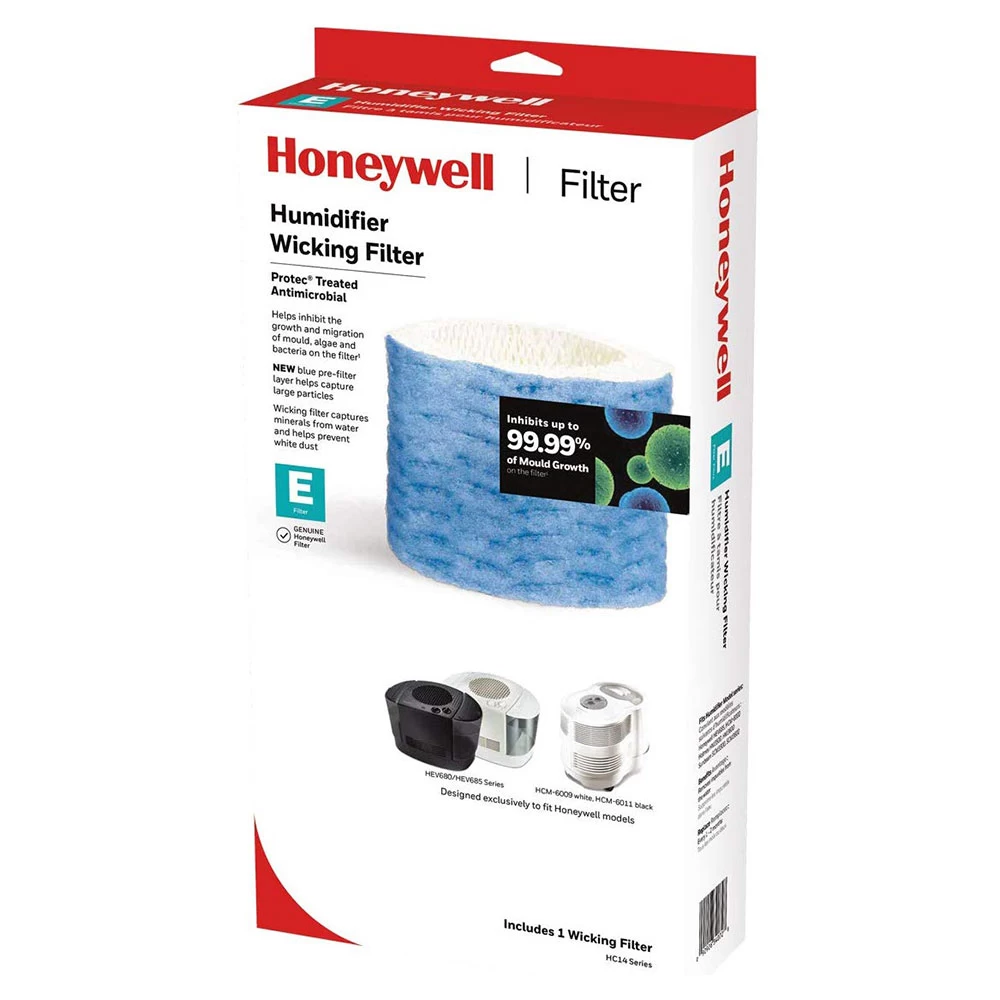 The Honeywell HC14 Filter E works with evaporative Honeywell console humidifiers: HCM-6009, HCM-6011, HEV680 & HEV685 model series. Genuine Honeywell replacement wicking filters helps inhibit 99.99% of growth & migration of mold, algae & bacterial on the filter1. Wicking filters capture minerals & pollutants in the water in your humidifier & helps prevent white dust, the new blue pre-filter layer helps capture large particles and provides additional structural support for the filter.