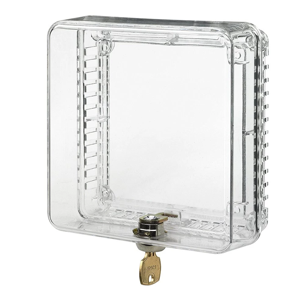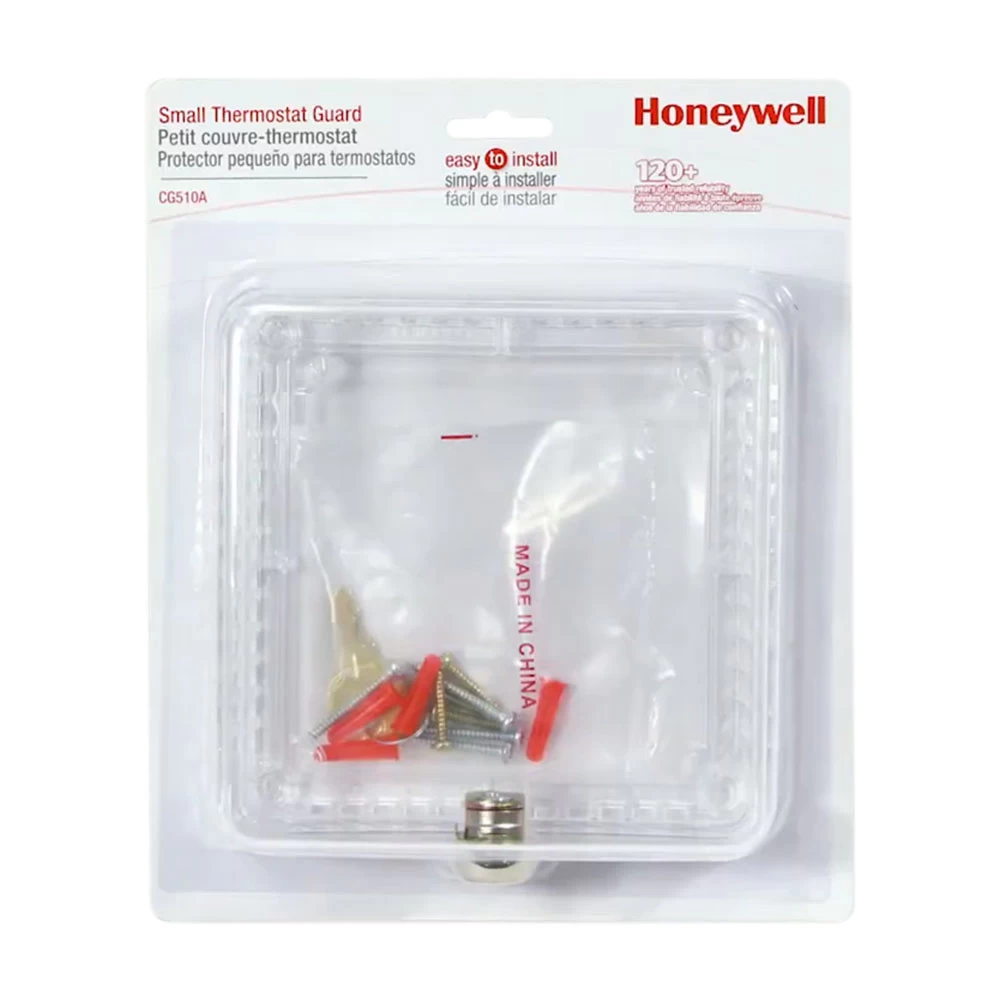 The Honeywell CG510A1019 Small Thermostat Guard provides the ideal defense in preventing others from tampering with your heating and cooling options. An elevated peace of mind is established as users will no longer have to worry about any unauthorized access that may result with adjustments or damages. Installation is near effortless and the Guard will fit on all Small Sized (4 7/16″ W x 4 7/16″ H x 2 1/4″ D or smaller) Honeywell thermostats and a host of others. The actual casing is chemical and UV resistant which allows users to deploy their cover all year round without the slightest concern. A steadily constructed key and lock function will perform admirably as a versatile defense. Eliminate the thought of others having access to your personal thermostat with Honeywell’s highly affordable and practical solution.