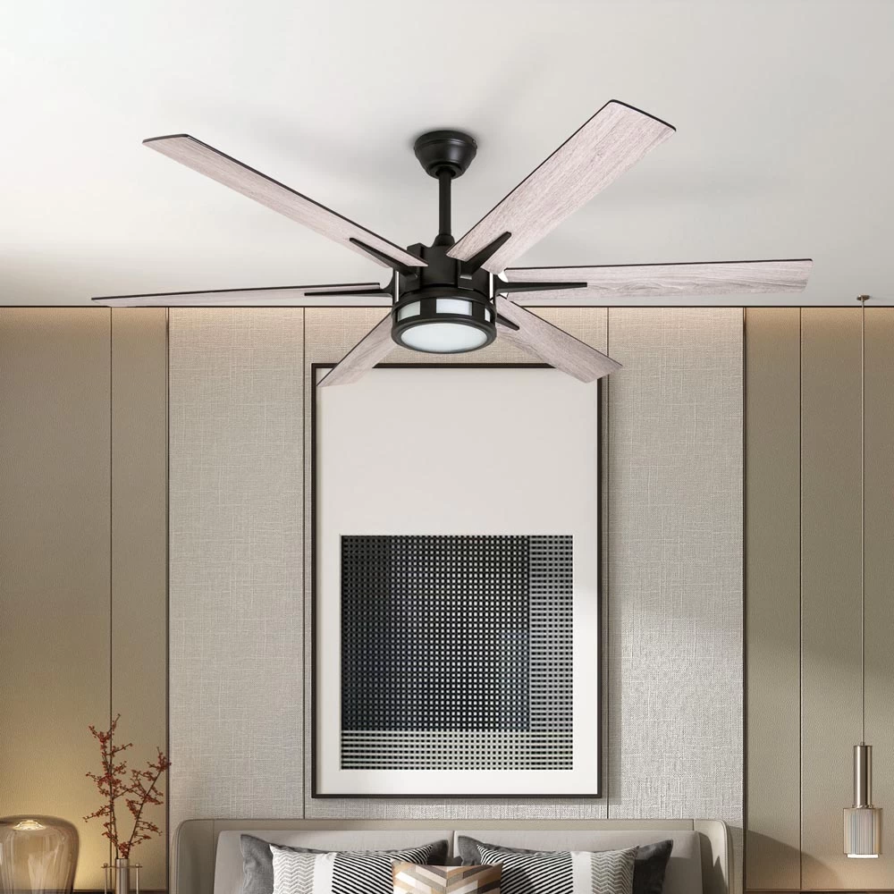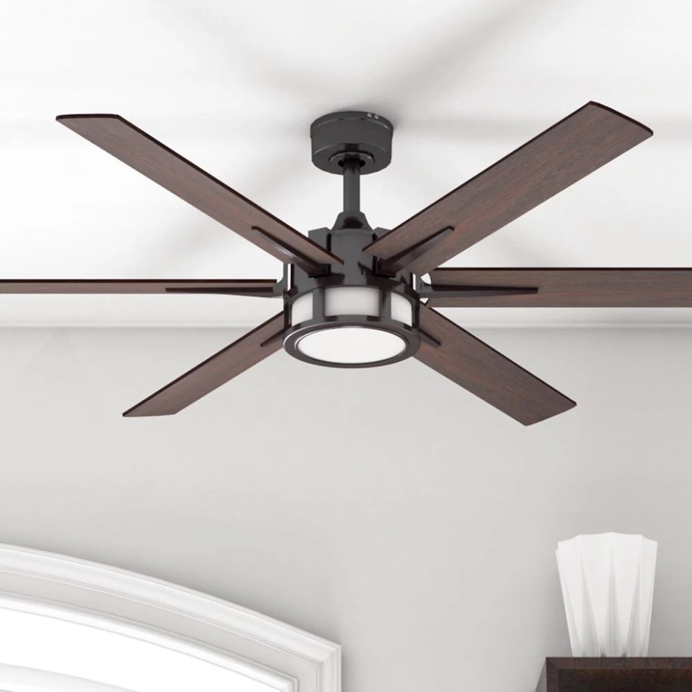 From the tip of the canopy down to the unique lantern-inspired light, the 56 in. Honeywell Kaliza Ceiling Fan says home sweet home with a bold and contemporary flair. Each blade is easily adjusted and reversible! The frosted finish on the light gives a very crisp and tailored look while adding just the right amount of illumination to your beautiful spaces. This ceiling fan is a perfect fusion of a modern look with an industrial farmhouse twist.