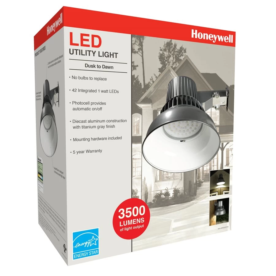 Honeywell LED Utility Lights provide a simple and energy efficient means of simultaneously offering peace of mind as well as enhancing the overall security of your home or place of work. Honeywell LED Utility Lights supply energy efficient illumination for your home or outdoor workspace. This set includes hardware that mounts directly to a wall or pole for swift and effortless installation. This LED Utility Light by Honeywell offers 3500 lumens of light output.