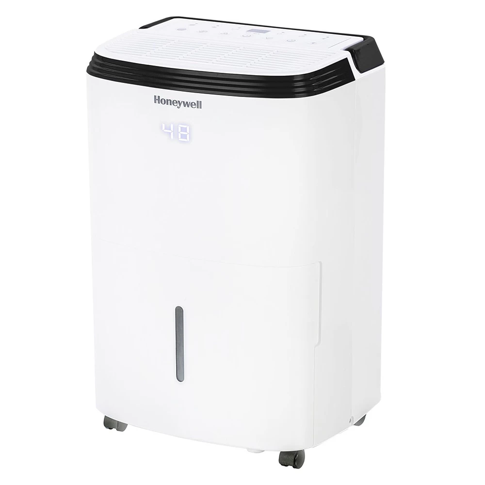 The Honeywell TP70WKN 70 Pint (50 Pint 2019 DOE Standard)* Energy Star Dehumidifier effectively removes moisture to protect walls, curtains, furniture and appliances from mold and mildew. An ideal addition for medium to large rooms such as basements, crawl spaces, dens, bedrooms and bathrooms, this ENERGY STAR qualified dehumidifier provides powerful moisture removal with minimal energy consumption. The continuous drain option allows you to continuously drain the condensate water for long unattended operation. This Honeywell Dehumidifier includes a smart digital humidistat control system that automatically senses room moisture levels and activates dehumidification to help maintain desired humidity levels. Smart digital controls offer fast and convenient operation while a unique and elegant front mirage display will allow you to monitor humidity changes from across the room.