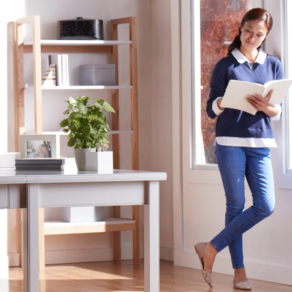 The True HEPA Tabletop Allergen Remover can help capture up to 99.97% of airborne allergens and particles.1. This hepa air purifier is efficient at capturing airborne pollutants like dust, pollen, pet dander, mold spores, tobacco, cooking and fireplace smoke particles. This personal air purifier can also help reduce odors and VOCs.3 The compact size is perfect for small rooms in the home office or nursery. This air purifier for allergies uses a mechanical filtration process – meaning that the fan pulls the particle-filled air into the unit and forces that air through a HEPA filter. This effectively cleans and circulates the air in small rooms (90 sq. ft.) up to 4.8 times an hour.2