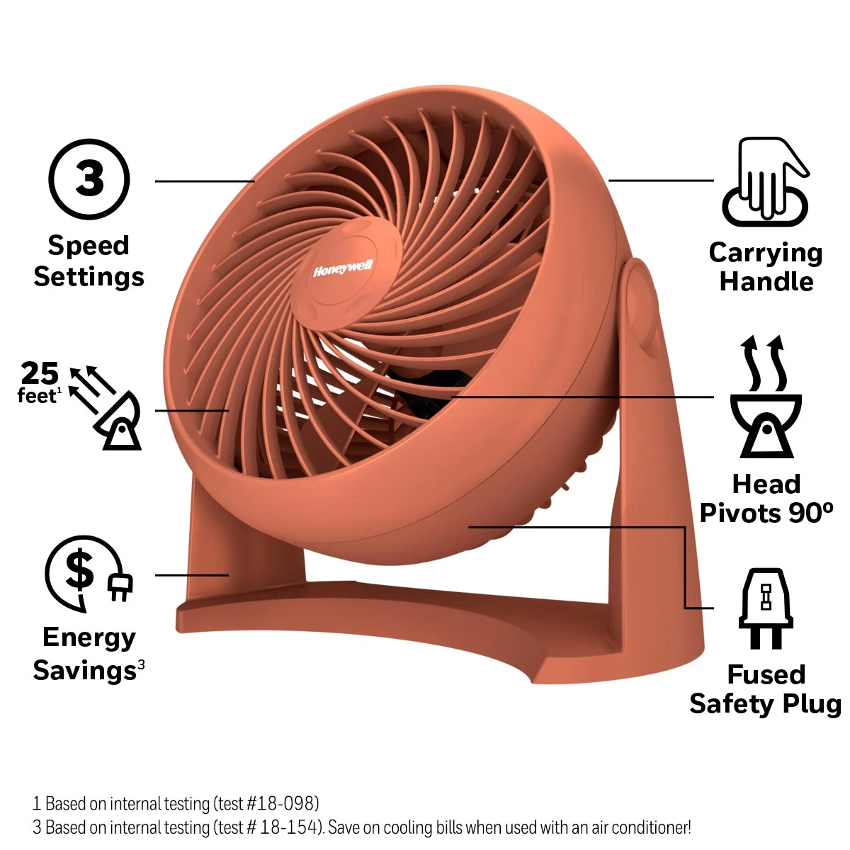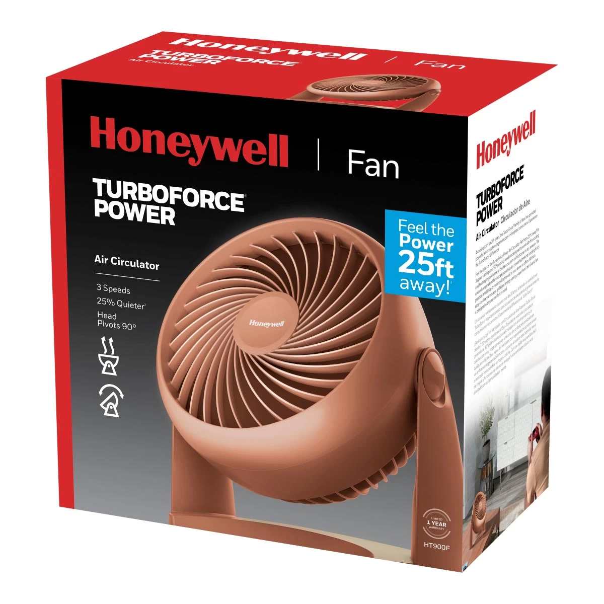 The 3 speed Honeywell HT-900F TurboForce Air Circulator provides a quiet and efficient means of cooling a surrounding area. The HT-900F is 25% quieter than its competitors and represents a superior selection for those seeking a relatively noiseless experience when it comes to emitting large amounts of cool air. An adjustable fan head is fully capable of pivoting and reaching a 90° angle that can be used for direct cooling or circulating the air. Maximum air distribution is achieved via the inclusion of an Aerodynamic Turbo Design. This fan’s small size and efficient output opens a wealth of installation options in the home, office or dorm setting. The availability of three selectable speeds carries the added bonus of potentially reducing energy expenses. The TurboForce Air Circulator Fan can be used for personal or powerful directional cooling.