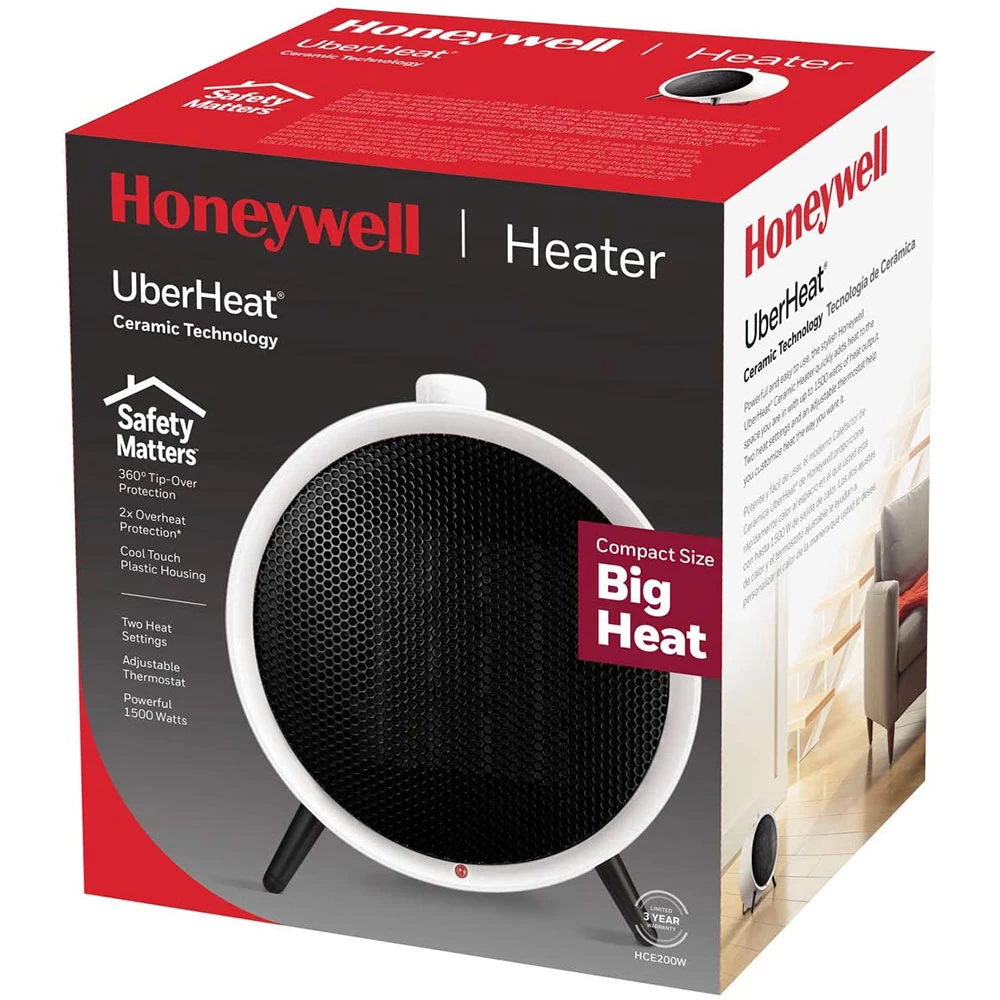 The Honeywell UberHeat Ceramic Personal Heater is the latest innovation in a series renowned for affordable and portable heating. This personal heater uses ceramic heating technology that offers a 1500 watt output, making it an excellent selection for heating small to personal areas of space. The Honeywell UberHeat Heater features two settings. Max Heat provides whole room heating while the Low Heating option is better suited for personal heating. The addition of an adjustable thermostat offers a clear visual of the surrounding temperature and allows you to set your personal heater accordingly. Overall safety has also been addressed with the additions of a tip-over switch, overheat protection and cool touch housing. The compact design of the Honeywell UberHeat Ceramic Personal Heater makes it a natural addition for any number of settings as it can easily be maneuvered from one location to the next.